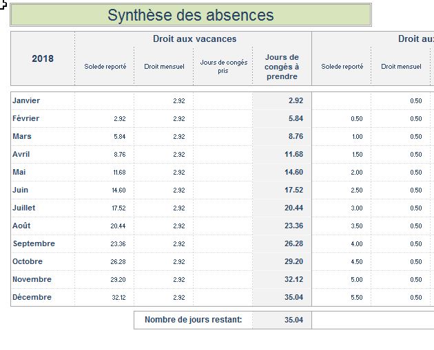 Synthèse mensuelle du solde des vacances et fériés par employé
